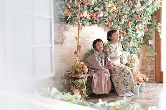 特に、ビンテージとは異なる味わいのコフレオリジナル和装は七五三撮影でも大変人気が高く、ごきょうだいやご家族様のトータルコーディネートのご提案や、お⾐装のレンタルも可能です(※3)。お宮参りの産着レンタルサービスも承っており(※4)、撮影前後1か月の期間であれば無料でご利用いただけます。
