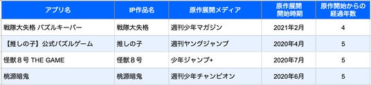 そのうちリリース後に月間平均TOP20入りを果たした3タイトルはいずれも、原作側で新たな展開が行われています。具体的には続編の連載開始や再アニメ化、新作アニメの制作発表などがあり、これらの作品ではIPを“現在進行形の資産”と捉え、IPの認知や熱量を再び高める活用方法として、ゲーム化もその一環として活用されていると考えられます。