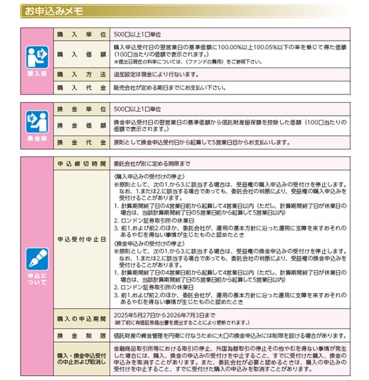 - 株式または金銭の拠出により当ファンドの取得(応募、追加設定)をご希望の場合には投資信託説明書(交付目論見書)を販売会社(指定参加者)よりお渡しいたしますので、必ず内容をご確認ください。