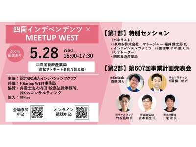 5/28(水)香川県高松市にて、J-Startup WEST選定企業(四国地域5社)が、投資家、事業会社、支援機関等向けに事業計画を発表する「四国インデペンデンツ×MEETUP WEST」を開催します。