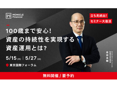株式会社モニクルフィナンシャル(本社:東京都千代田区、代表取締役CEO:原田慎司)は、2025年5月15日(木)と5月27日(火)に東京国際フォーラムで、無料の資産運用セミナー「100歳まで安心!資産の持続性を実現する資産運用セミナー- 新NISAと債券の活用法 -」をシリーズ第一弾として開催します。本セミナーのテーマは、「老後の安心」です。資産の持続性を実現するための戦略や、新NISAを活用した投資信託の選び方、安定的な運用ができる債券での投資のポイントを、時局を踏まえた視点で90分間たっぷりと解説します。