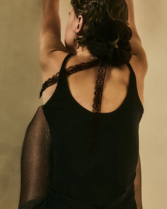 ブラックならではの引き締め力がありながら、シアー素材を用いたことで軽やかに纏えるのも特徴。