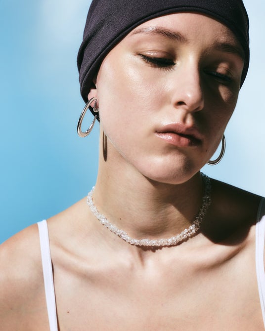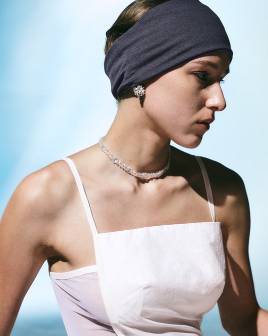 minimal turban / gray ¥4,950 petit apollon earring / silver ¥11,000 kaleid crystal necklace ¥17,600