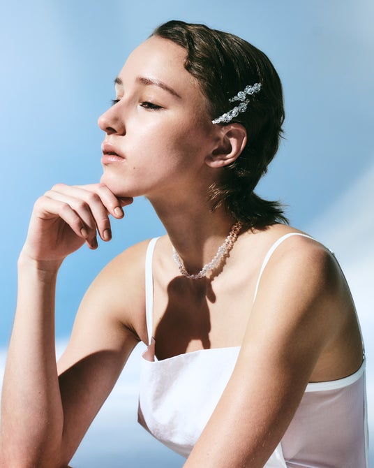 雨雫を思わせるみずみずしい水晶のパーツから、肌がほのかに透け、美しい奥行き感を叶えます。