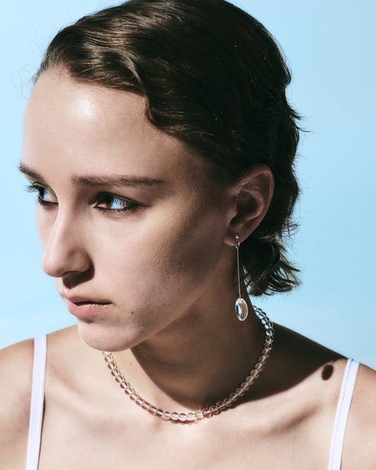 水晶つきのロングチェーンがたゆたい、表情を優しく見せながら個性ももたらします。