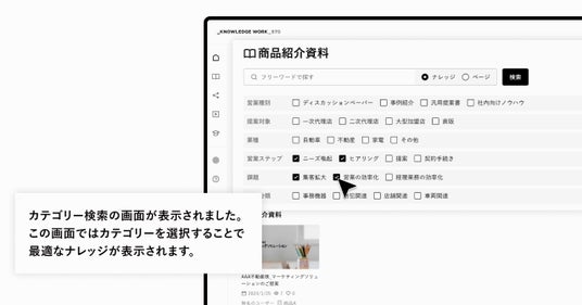例えば、商品紹介における商品紹介資料を探す際には「フリーワード検索」を中心に設定し、商品名などから探せるようにする、顧客提案における過去提案書を探す場合には「カテゴリー検索」を中心に設定し、顧客の業種や課題から探せるようにする、営業進行における契約手続きを調べる場合には「チャット検索」を設定し、知りたい手続きをチャット形式で質問できるなどが可能になります。