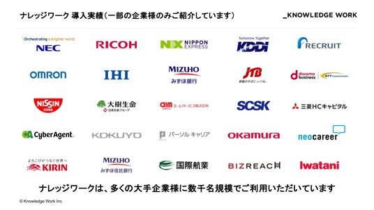 ナレッジワークは「できる喜びが巡る日々を届ける」をミッションに掲げ、働く人たちのイネーブルメント(成果の創出や能力の向上)を支援するスタートアップです。働く人たちにイネーブルメントを届け、プロダクトを通じて優れたワークエクスペリエンス(業務体験)を実現するため、現在は主に大手企業を対象に営業支援およびセールスイネーブルメントAI「ナレッジワーク」を中心に開発・提供しています。主にNTTコミュニケーションズ様、みずほ銀行様、日清食品様など、大手企業を対象に数千名規模で導入され、セールスイネーブルメントを実現するための基盤として選ばれています。