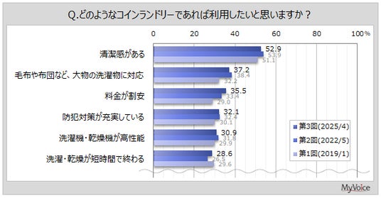 今後、コインランドリーを利用したくない・あまり利用したくないと回答した層では、「清潔感」「料金が割安」「防犯対策が充実」が上位3位です。