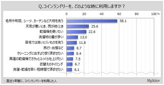直近1年間にコインランドリーを利用した人に、どのような時に利用するかを聞いたところ(複数回答)、「毛布や布団、シーツ、カーテンなど大物を洗う」が58.1%、「天気が悪いとき、雨が続くとき」が25.6%、「乾燥機を使いたい」が22.6%です。