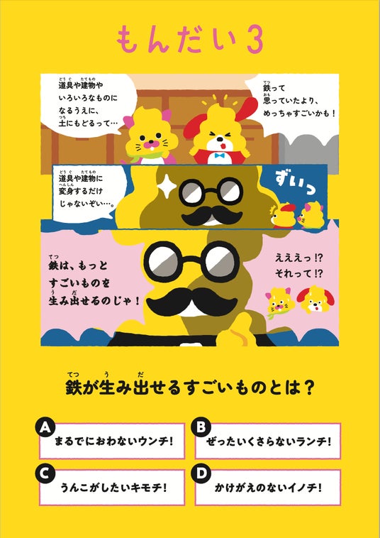 冊子は全5問のクイズ形式で展開されます。うんこ先生から出題される「うんこ」というキーワードがちりばめられたユーモアあふれるクイズの設問や選択肢はもちろん、シュールで可愛らしいイラストとテンポよく展開されるストーリーが、子どもの興味を惹きつけながら、鉄の歴史やリサイクル、環境保護への貢献などを楽しく理解できる構成になっています。