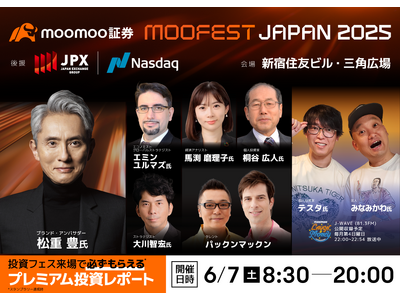 国内でアプリダウンロード数150万件(※1)を突破したmoomoo証券株式会社(ムームー、本社:東京都渋谷区、代表取締役社長:伊澤フランシスコ、以下「moomoo証券」)は、6月7日(土)に、国内初の大型投資イベント「MooFest Japan2025 ~激動の世界経済と新時代の投資戦略~」(ムーフェス・ジャパン 2025)を都内で開催いたします。