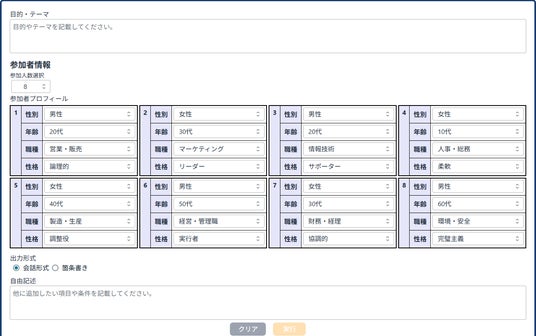 ブレインストーミングブレインストーミングしたいテーマや目的を入力し、参加者の情報を選択します。実行すると会話形式または箇条書きでブレインストーミング結果を出力できます。18の職種・24の性格から選択できるため、様々な視点から意見を募ることが可能です。