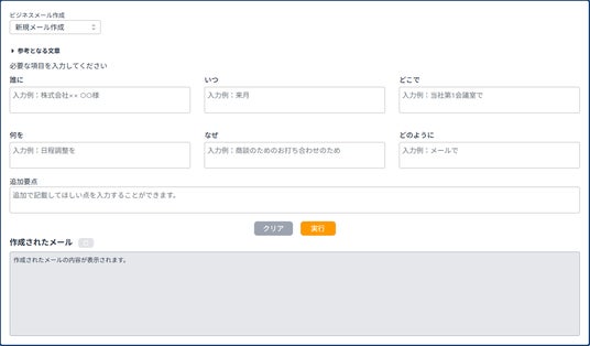 参考となる文章として、ご利用者様の普段のメールのサンプルを入力いただくことで、その記載ルールに沿った文章が作成されます。