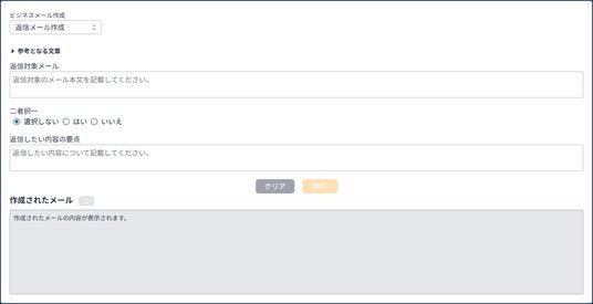 返信メール作成「返信メール作成」を選択し、返信対象のメール本文を入力します。「はい(肯定的)」・「いいえ(否定的)」の二者択一を選択し、返信したい内容の要点について記載をすることで、メール文章を作成します。