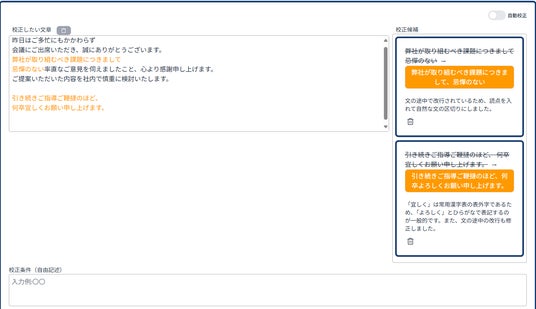 校正「校正したい文章」に校正対象の文章を入力します。実行ボタンをクリックすると自動で校正候補が出力されます。オレンジのボタンをクリックするだけで、校正候補を文章に修正・反映させることが可能です。
