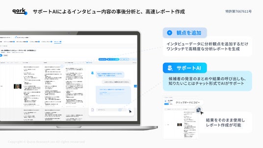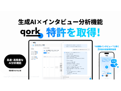 株式会社Quest Research(本社:東京都港区、代表取締役:南健太)は、生成AIを活用したインタビューサービス「qork(コルク)」に関する独自技術で特許を取得したことをお知らせします。