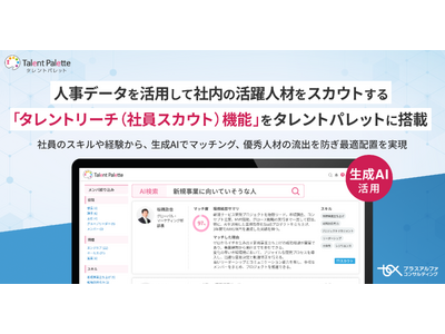 株式会社プラスアルファ・コンサルティング(本社:東京都港区、代表取締役社長:三室克哉、証券コード:4071、以下:PAC)は、科学的な人材活用や人的資本の開示、人事業務のDX化、リスキリング推進などを目的に、多くのエンタープライズ企業で導入が進んでいるタレントマネジメントシステム 「Talent Palette(以下:タレントパレット)」 に蓄積された、社員の所属部門やスキル・経験、性格傾向、キャリア希望といった人材情報から、社内人材を発掘しスカウトできる 「タレントリーチ(社員スカウト)機能」 を新たに搭載します。