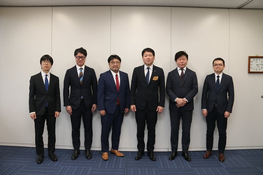 (左から (株)エナーバンク:関根 大輔、村中 健一、佐藤 丞吾、八峰町町長:堀内 満也、(株)まち未来製作所:青山 英明、グローバル・インフラ・マネジメント(株):土田 博志)