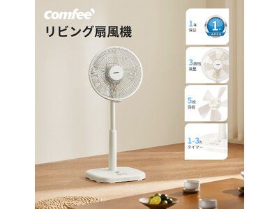 COMFEE'のリビング扇風機は、静音設計と左右自動首振り機能を備え、上下角度調節や3段階の風量調整が可能。