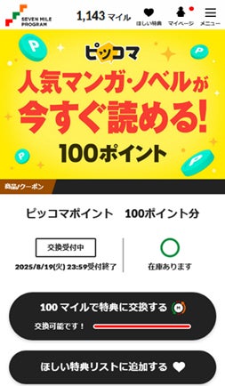 「セブンマイルプログラム」の特典に「ピッコマWEBポイント」が新登場。