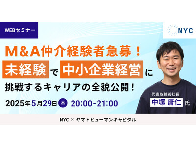 ヤマトヒューマンキャピタル株式会社(本社:東京都千代田区、代表取締役:堀江 大介)は、2025年5月29日(木) 20:00よりオンラインにて、NYC株式会社 代表取締役社長 中塚 庸仁 氏にご登壇いただくウェビナー『中小企業経営に挑戦するキャリアの全貌公開!』を開催いたします。