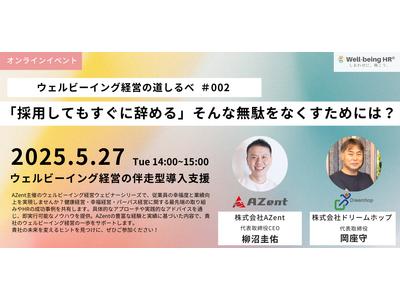 基幹業務システムベンダーであるピー・シー・エー株式会社(代表取締役社長:佐藤文昭 本社:東京都千代田区 プライム銘柄コード9629 以下:PCA)のグループであり企業のメンタルヘルス支援および人材定着をサポートする株式会社ドリームホップ(代表取締役:岡座守 本社:東京都千代田区 以下:ドリームホップ)は、ウェルビーイング経営の伴走型導入支援を行う株式会社AZent(代表取締役CEO:柳沼圭佑 本社:東京都港区 以下:AZent)と共同で「ウェルビーイング経営の道しるべ」第2回「『採用してもすぐに辞める』そんな無駄をなくすためには?」を2025年5月27日(火) 14時より、オンライン開催することをお知らせいたします。
