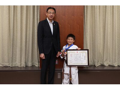 高槻市立柳川小学校3年生の谷口翠春さんが令和7年5月16日(金曜日)、高槻市役所を訪問し、2月に福岡県で開催された「第4回極真手塚杯世界空手道選手権大会」小学2年男子の部門で優勝したことを濱田剛史市長に報告しました。