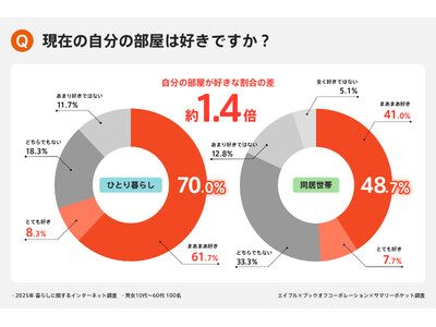 今回の調査によると、ひとり暮らしの約7割が「現在の自分の部屋が好き」と回答しました。「自分だけのプライベートな空間」「自由に模様替えができる」「好きなモノに囲まれて心地よい」といった理由から、ひとり暮らしの多くが自分の部屋に強い愛着を感じていることが明らかになり、同居世帯と比較して、約1.4倍高い満足度を示す結果となりました。