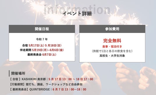 開催場所:合宿(KASHIKIRI 奥京都)、最終発表会(QUINTBRIDGE)