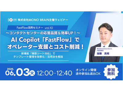 カスタマーサポート(CS)領域のAIソリューションを提供する株式会社MONO BRAIN(本社:東京都渋谷区、代表取締役:加藤真規)は、2025年6月3日(火)12時より、コンタクトセンター運営事業者様を対象とした無料オンラインウェビナー「「FastFlow」実践ウェビナー (vol.10)」を開催いたします。