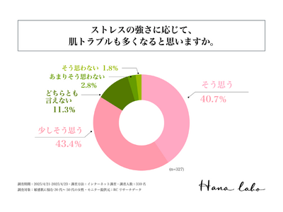 5月は新年度の環境の変化や仕事・人間関係の溜まっていたストレスが表面化する時期です。また近年、ストレスと肌トラブルの関連性が注目されており、「ストレスが肌の状況を悪化させる」という実感がある人は多いのではないでしょうか。また、敏感肌の方であれば、その影響も顕著に感じるものと思われます。そこで「HANA LABO」は、敏感肌に悩む20代~50代の女性を対象に「ストレスと肌トラブルの関係性」に関する調査を実施しました。