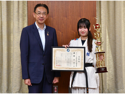 この日、受賞報告に高槻市役所を訪問した濱さんは、「怪我を乗り越えて空手を続け、念願の日本一になれて嬉しかったです」と話し、濱田市長は「怪我を克服して優勝した濱さんの努力に敬意を表します。今後のさらなる飛躍を期待しています」と優勝を称えました。