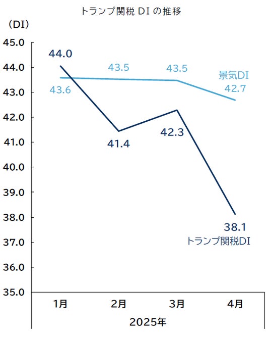 TDB景気動向調査の回答者のコメント(自由記入)のうち、「トランプ関税」に言及したコメントの割合[1]をみると、2025年1月は1.2%だったが、2月以降右肩上がりで推移し、最新の4月調査では12.3%と急上昇した。コメントの内容を分析すると、トランプ関税に対する警戒感や不透明感が急速に高まっている現状がみてとれる。また、トランプ関税に対するコメントを寄せた企業の景況感(以下、「トランプ関税DI[2]」)を算出すると、4月の結果は38.1となり、全体の景気DI(42.7)と比較して4ポイント以上落ち込んだ。加えて、3カ月連続で全体の景況感を下回り、企業の危機意識の高まりにとどまらず実際に悪影響が表れつつある様子もうかがえる。