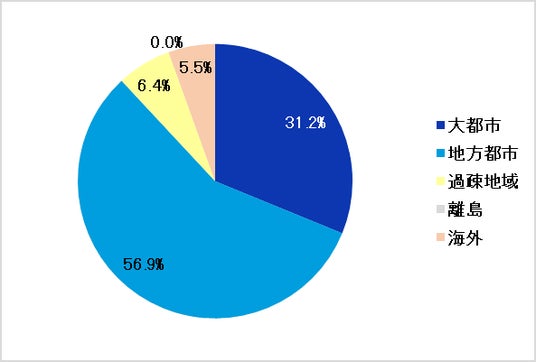 1位「地方都市」(56.9%)、2位「大都市」(31.2%)という結果となった。「地方都市」の方が「大都市」より人気が高く25.7ptの差があった。「過疎地域」はわずか6.4%に留まり、「離島」は全くいなかった。
