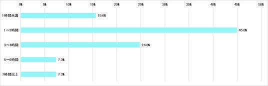 「1~2時間」が最も多く、45.0%となった。次いで、「3~4時間」(24.8%)、「1時間未満」(15.6%)の順となった。医学生は長時間勉強しているイメージがあるが、今回の調査では、「2時間以下」が約6割(60.6%)を占める結果となった。一方で、1日平均5時間以上勉強するという人も14.6%いた。