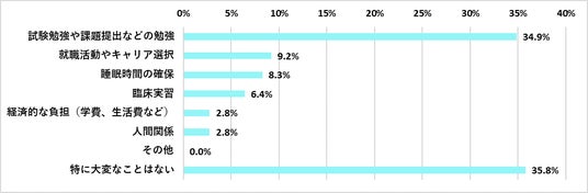 「試験勉強や課題提出などの勉強」が圧倒的に多く34.9%となり、2位以下の「就職活動やキャリア選択」(9.2%)、「睡眠時間の確保」(8.3%)、「臨床実習」(6.4%)を大きく引き離した。一方「特に大変なことはない」も3割強(35.8%)となった。