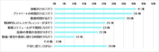 全体の7割強(73.4%)が、1つ以上「不安に思うこと」をあげた。「不安に思うこと」の1位は「休暇がとりにくそう」(41.3%)、2位は「プライベートの時間がとりにくそう」(39.4%)、3位は「勤務時間が長そう」(35.8%)となり、医師の長時間労働を危惧する回答が上位を占めた。