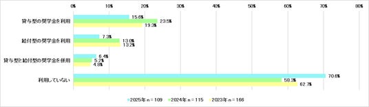 「奨学金を利用」という回答は、「貸与型」「給付型」「貸与型と給付型を併用」を合わせて約3割(29.3%)となり、3人に1人が奨学金制度を利用していることが分かった。奨学金利用者は、昨年比で12.4ptダウンした(2024年は41.7%)。また、貸与型と給付型の比較では、貸与型を利用している人の方が多かった。