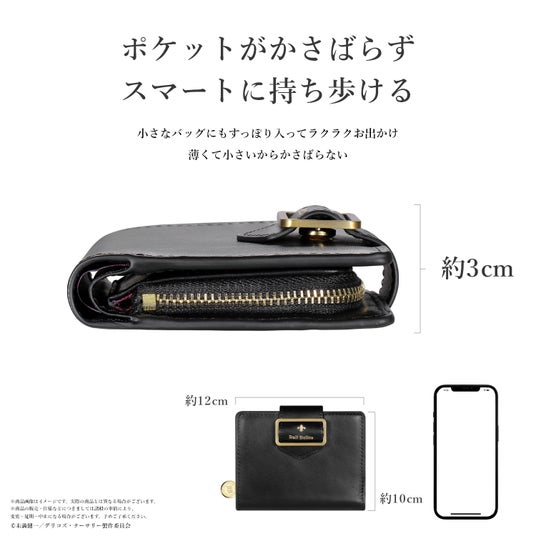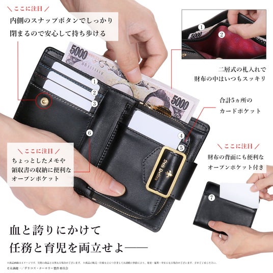血と誇りにかけて、任務と育児を両立せよ。「デリコズ・ナーサリー」の物語を身近に感じられるイタリアンレザー二つ折り財布。ゴシック様式を象徴するデザインが施された本革に、ダリ・デリコの名を刻んだ金属装飾フレームがアクセントを加え、気品あふれる仕上がりに。公式ロゴ入りの特製ボックスでお届けします。