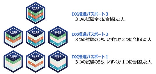「ITパスポート試験」、「DS検定 リテラシーレベル」、「G検定」の3試験の合格数に応じた3種類のバッジを発行します。3試験のうちいずれか1種類の合格者には「DX推進パスポート1」、いずれか2種類に合格すると「DX推進パスポート2」、3つ全てに合格すると「DX推進パスポート3」のデジタルバッジが発行可能となります。
