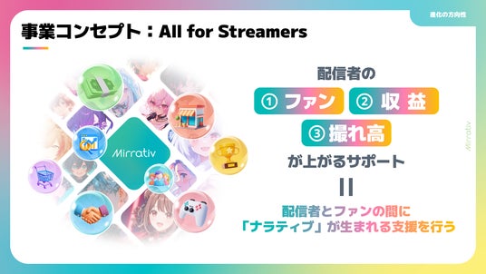 グループスローガンは「All for Streamers」。配信者とファンの間に生まれるナラティブ(物語)を支え、配信者の「1.ファン獲得」「2.収益化」「3.撮れ高向上」の三軸で支援することを目指します。