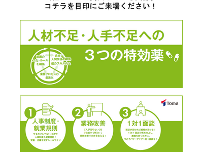 各企業にとって適切な「3つの特効薬」(1.人事制度・就業規則 2.業務改善 3.1対1面談)をご提案いたします。是非ブースおよびセミナーにお立ち寄りください。