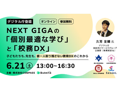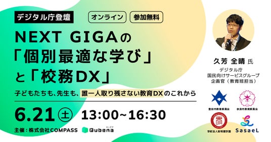 学習eポータル+AI型教材「キュビナ」を開発・提供する株式会社COMPASS(本社:東京都千代田区、代表取締役:佐藤潤、以下 COMPASS)は、「NEXT GIGAの『個別最適な学び』と『校務DX』」をテーマに、省庁・自治体・学校法人・事業者をゲストに迎えてNEXT GIGAにおける教育DXの取り組みについて共有し、その未来を語り合うオンラインイベントを2025年6月21日(土)に開催することをご報告いたします。