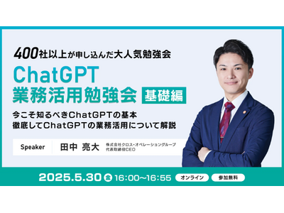 ChatGPTの基礎から、具体的なビジネス活用事例までを分かりやすく解説する勉強会を開催します。すでに400人以上が受講し、その効果を実感しています。ChatGPTをビジネスのインフラとして活用し、業務効率化を図りたい方は、ぜひご参加ください。