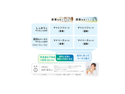 新サービスのコンセプトは「One to One」です。対象者が自身の健康目標に合わせたプランを選べることで、パーソナライズされた支援に繋がります。肥満タイプに基づくアプローチを通じて、健康意識を高めることを目指し、対象者の参加率・完了率の向上に繋げます。