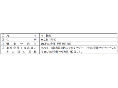 なお、TKKは六本木や銀座等を中心に土地・不動産を多数保有する貸しビル業を祖業としながら、六本木交差点に所有する約 110 坪の土地で年内着工予定の高級ホテル開発・運営に進出するなどの積極的な多角化で知られております。さらに近年では、南氏が中心となって、TKKおよび南氏個人が成長産業への積極的な投資と企業買収および企業価値向上をおこなっております。こうした投資先には、TKKが保有する国内トップクラスの産業用ドローンメーカー株式会社マゼックスを初め、南氏の個人保有企業として当社の営業活動支援の契約関係にあるマーケティングプロ集団である株式会社CTF GROUP、同じく個人保有企業として寿司職人養成学校のリーディングカンパニーである株式会社SUSHI、同じく個人保有企業としてブランド名「FILLIN」で知られるスニーカー製造販売業の株式会社NOVEL REPUBLICなど数多くの企業が存在します。南氏は、これら企業のM&Aを主導したほか、エンジェル投資家としてのスタートアップ支援と投資育成業務、不動産収益化、投資対象への企業価値向上、長期的な関係構築を前提とした上場企業への事業譲渡なども複数経験しております。
