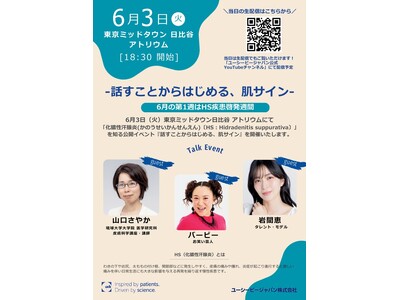ユーシービージャパン株式会社(本社︓東京都新宿区、代表取締役社長︓菊池 加奈子)は、6 月 3 日(火)東京ミッドタウン日比谷にて「化膿性汗腺炎(かのうせいかんせんえん)〔HS︓Hidradenitis suppurativa〕」を知る公開イベント「話すことからはじめる、肌サイン」を開催いたします。