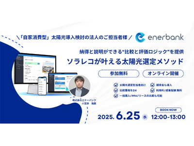 株式会社エナーバンク(東京都中央区、共同創業者 代表取締役:村中 健一・佐藤 丞吾、以下「エナーバンク」という。)は、2025年6月25日に太陽光発電設備の導入検討者に向けた無料オンラインセミナーを開催いたします。