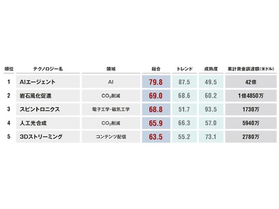技術の成長期待値をスタートアップの資金調達動向を基に算出。「AIエージェント」「岩石風化促進」「スピントロニクス」が上位