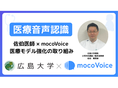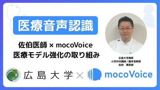 音声認識AI「mocoVoice」の医療分野における可能性を追求し、広島大学病院 小児外科講師/臨床准教授である佐伯 勇医師と共同で医療モデルの強化に取り組んでいます。 この度、本取り組みの詳細や、佐伯医師が実際にmocoVoiceを導入・活用されたリアルな声、そして今後の医療現場におけるAI音声認識への期待などをまとめたインタビュー記事を、mocomoco株式会社のウェブサイトにて公開いたしました。